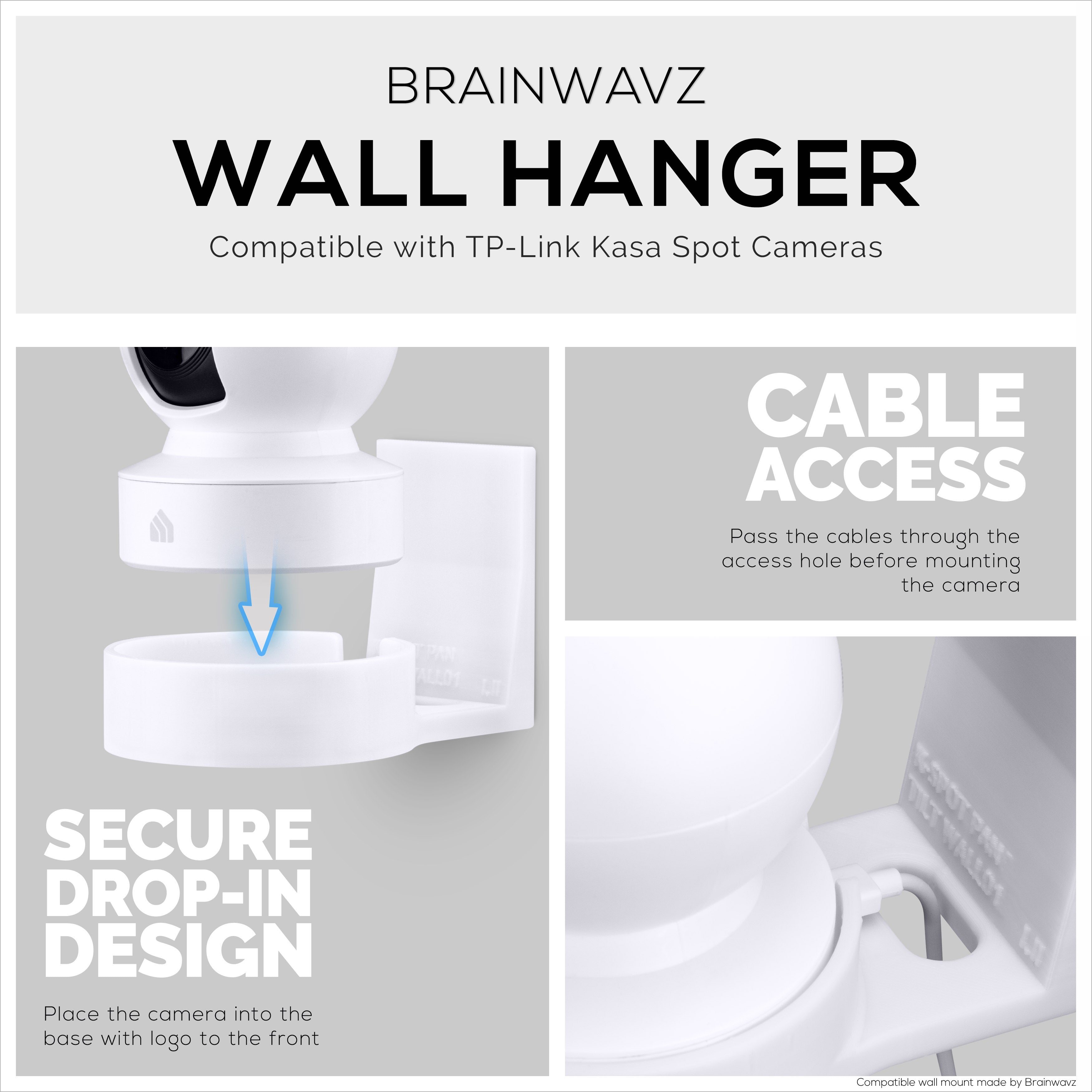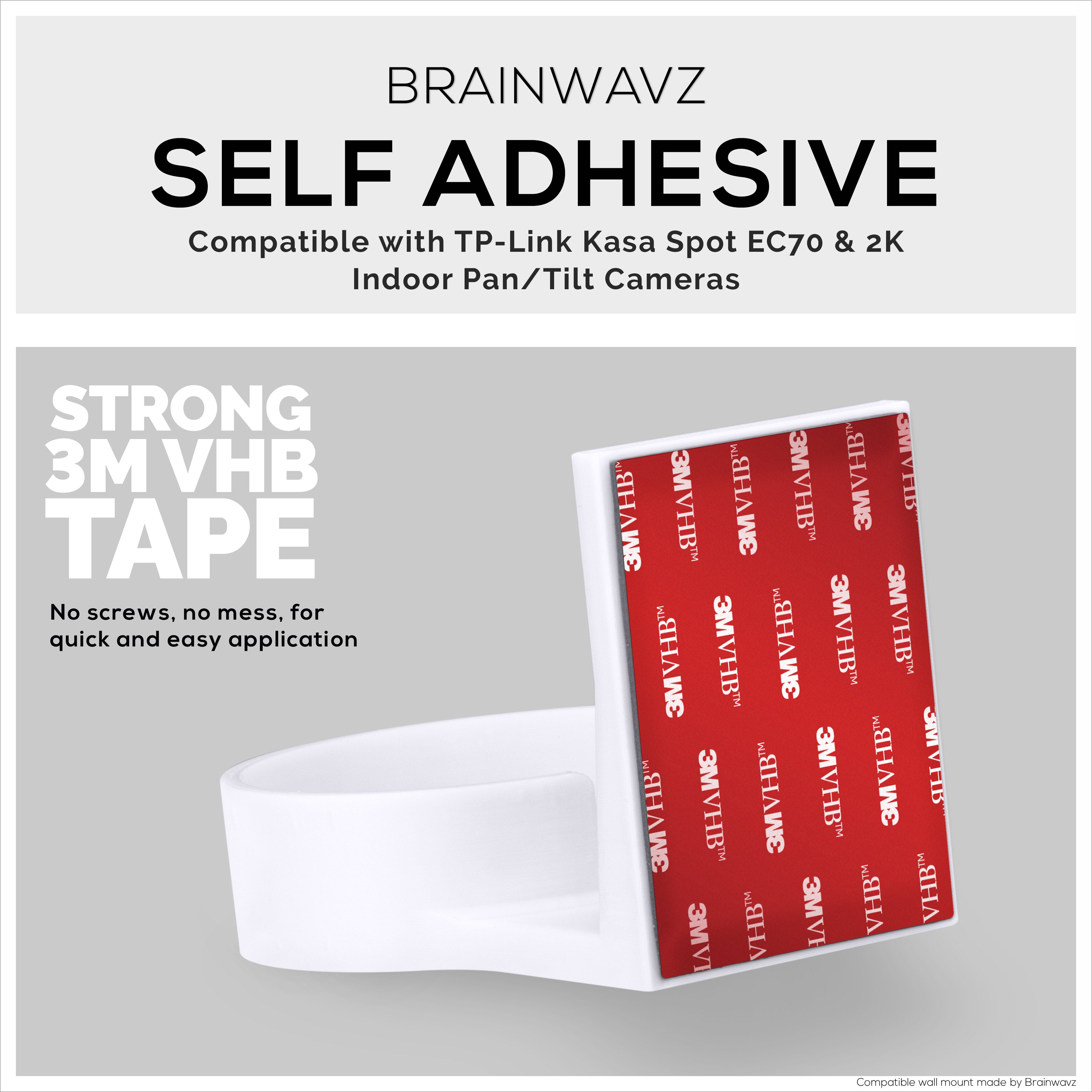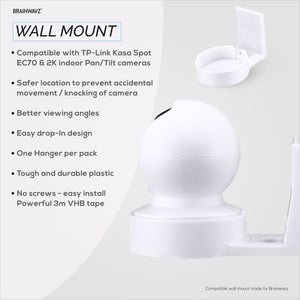 Easy to install wall mount for your TP-Link Kasa Spot (EC70) & 2K Indoor Pan/Tilt security camera. Simply remove the safety tape cover from the back of the holder, and place it high up in the corner of a room, let it sit there for at least 6 hours then push your camera into the holder.
