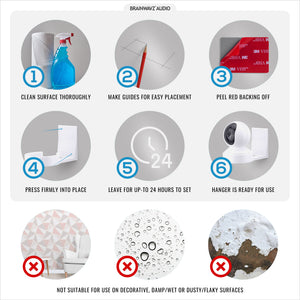 Your camera fits easily and securely into the custom designed base, no screws or bolts. The wall mount attaches easily with super strong VHB tape, with no mess and no drilling needed, opening up even more locations to mount your camera.